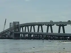 Bridge B is the middle bridge, and is also the shortest of the three bridges. The current Bridge B opened for traffic on April 11, 2007, making it the first of the current spans to open. The current Bridge B was built ten feet taller than the original Bridge B to help reduce corrosion from salt spray, which was one of the major factors in the deterioration of the old bridge. Unlike the other two bridges, Bridge B is a low-level bridge, and has no navigation channel passing underneath.