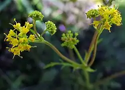 Sanicula tuberosa is a species of flowering plant in the parsley family known by the common name turkey pea.[1] It is native to western North America from Oregon through California to Baja California, where it can be found in many types of habitat, including chaparral, forests, and woodlands. It is variable in appearance. In general, it is a perennial herb producing a slender stem up to 80 centimeters long from a small, spherical tuber no more than 2 centimeters wide. The leaves are compound, divided into usually three leaflets which are smooth or deeply cut into lobes. The herbage is green to purple in color. The inflorescence is made up of one or more heads of bisexual and male-only flowers with tiny, curving, yellow petals. The fruits are 1 or 2 millimeters long and covered in bumpy tubercles.
