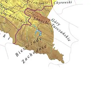 The Sanok-Turka mountain range stretches on an area of 930 km2 to the north of the Bieszczady Mountains, and to the south of the Przemyskie Upland, between the valleys of the middle San and Stryi River. They extend after the river Stryi by the Beskidy Brzeżne. The northern boundary is made by the rivers Wiar, Łomna, Stupnica, Leszczawka, Lachawka and Tyrawski, the western valley of the river San.[1] Sometimes the territories to the East and South of the river Wiar, (like the Sucha Obycz Massif), and the east of the Lachawka river valley to the valley of the river San (Wysokiego mountain range) are added to Sanocko-Turczańskie mountains (there are also different variations of the northern border). The southern border is generally carried through the ridges of the Otryt mountain range and through the San where the Tyrawski river joins as a tributary, although sometimes the Otryt mountain range is linked with the Sanocko-Turczańskie mountains, then the southern border is the Upper San river.[2]