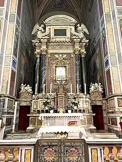 The 1606 painting Madonna of Loreto (also known as the Madonna of the Pilgrims) by Caravaggio is located in the first chapel on the left.[4] The heirs of Ermete Cavalletti (?-1602) bought the Pieta Chapel on 4 September 1603 and soon commissioned Caravaggio to paint the Madonna for their family's chapel. It was hung in 1606 at the altar in the Cavalletti Chapel (former Pieta Chapel) in place of a Pieta that was sold to Pope Paul V (formerly Cardinal Camillo Borghese).