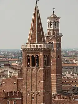 Near the left arm of the transept, at the top of the first apsidal chapel on the left, rises the imposing bell tower, of which little is known about its history. Seventy-two meters high and divided into six orders by white stone string courses, the Gothic tower has a pilastered shaft with recurring Lombard band decorations.[37] The shaft of the bell tower ends in a belfry with four splayed triforas, one on each side, divided by columns with shaft, pedestal and capital of Tuscan order,[38] and a balustrade of small white stone columns of elegant workmanship. From here, in turn, rises a conical spire in terracotta, intersected by slender white stone ogives.[39] The style of the construction dates it to the 15th century, but it is possible that it was begun even earlier, at the same time as the apse. There is a document, now lost, dated January 15, 1433, by the notary Antonio of Cavagion (today Cavaion Veronese), according to which the Dominican monks sold a house for 50 ducats and used the proceeds "for the construction of the bell tower". On three small stones set in the sides of the bell tower, the following inscription is carved in 15th century characters: "CHRISTUS REX | VENIT IN | PACE DEUS | ET HOMO | FATUS EST". According to the historian Ignazio Pellegrini, in 1555 the bell tower was struck by lightning and had to be restored. A similar event occurred in the following century, in 1661, forcing the Dominicans to spend two hundred ducats to repair the damage.[40]
