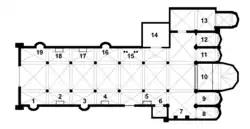 1. Fregoso Altar; 2. Manzini Chapel; 3. Bonaveri Chapel; 4. Pindemonte Altar; 5. Mazzoleni Altar; 6. Chapel of the Crucifix; 7. Centrego Altar; 8. Cavalli Chapel; 9. Pellegrini Chapel; 10. Presbytery; 11. Lavagnoli Chapel; 12. Salerni Chapel; 13. Sacristy and Giusti Chapel; 14. Chapel of the Rosary; 15. Organ; 16. Miniscalchi Chapel; 17. Altar of St. Raymond of Penyafort; 18. Faella Altar; 19. Boldieri Chapel.