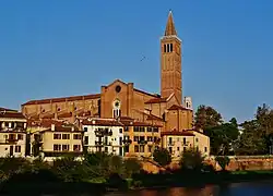 The church of San Pietro da Verona in Santa Anastasia,[1][2] better known as the basilica of Santa Anastasia, is an important Catholic place of worship that stands in the heart of the historic center of Verona; it is located at the end of the decumanus maximus of the city in Roman times, near the point where the wide meander of the Adige river is crossed by the Ponte Pietra, where the two main traffic routes of the city, road and river, gravitate. It is the largest, most solemn and representative church in Verona, a reflection of a lively moment in the city's life, when the expansion and consolidation of political and economic institutions allowed the community, in synergy with the Scaliger rule, the Dominican clergy and the Castelbarco family, to make a considerable financial effort to build this important temple, a symbol of their power.[3]
