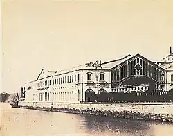 The actual project to construct the station at Cais dos Soldados was approved by the government on 8 March 1854.[3] The plan presented a station that included distinctive elements for commercial and passenger traffic, repair workshops, warehouses and services. For the passenger terminal, the government acquired the old Convent of Santa Apolónia, but the former army arsenal in the location was demolished to make way for the final design. From the beginning, the rail line and the commercial wharf required that land be reclaimed along the Tagus River.[4]