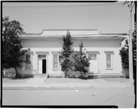 German immigrants settled in Santa Clara from the mid-1850s, and increased in numbers through the 1880s. The Santa Clara Verein was founded in 1868 as a Turnverein and social club, and members purchased land at the corner of Alviso and Benton Streets.[2] One co-founder was Jacob Eberhard, head of the Santa Clara Tannery, who later served on the Board of Trustees for the town of Santa Clara.[4][5] The club building was constructed in three phases: a social hall with a gable roof was extended on the south side by a second gable-roofed construction and later by a rear addition. Construction concluded in 1881.[2] Another false-front building across the street, known as the Larder House and reportedly a former stagecoach stop, was also used by the German American community.[6] The lodge building contained both a gymnasium and an auditorium and was used for dramatic performances, musical recitals, graduation exercises, and social activities such as dances.[2][7]
