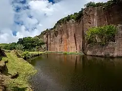 Its volcanic origin is characterized by a substratum of basalt deformed by a series of fractures that run along a northwest to southeast orientation (interlaced with lode and deposits of mafic silicate material), resulting in the following volcano-stratigraphic layers:[25]