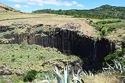 Ribeira do Maloás, 15 to 20 m (49 to 66 ft) tall basalt columns forming a waterfall[24]
