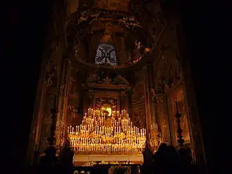 In the evening of Holy Thursday, the monumental Macchina delle Quarant'Ore ("Machine of the Forty Hours") is set up: it is a 19th-century structure based upon a 17th-century design, with floral decorations, made of carved and gilt wood on which more than two hundred candles are placed, so as to illuminate the mystical dark. It is perhaps the last structure of this kind still used in Italy.