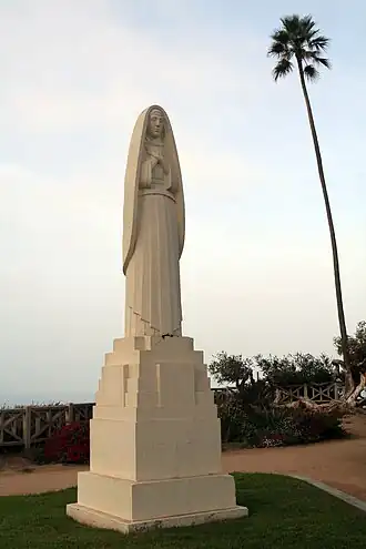The cast-cement sculpture of Saint Monica of Hippo is approximately 10 ft (3.0 m) tall and rests on a concrete base that is approximately 6 ft (1.8 m) tall.[3][4] (Father Juan Crespí visited the nearby Tongva Sacred Springs on an expedition in 1769; the scattered pools of flowing water reminded him of Monica’s tears for her son Augustine, of later Confessions fame.[5] The pre-statehood Rancho Boca de Santa Monica and Rancho San Vicente y Santa Monica, and eventually the city, all took the name of the Roman Catholic Saint.)