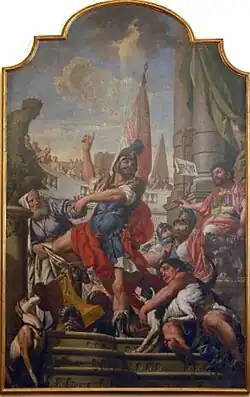 In the second chapel to the right, De Longe painted a fresco of Saint Teresa swooning before the child Jesus in an architectural niche by Giovanni Natali the younger. To the right of the choir is an altarpiece by Carlo Francesco Nuvolone. To the left of the sanctuary, there is a canvas depicting St Anthony of Padua by Francesco del Cairo.[3]