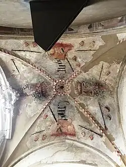 To the left of the baptismal font there is a 14th century painted marble statue depicting Saint Blaise. On the counter-façade there is a painted Madonna and child attributed to the school of Bernardino Luini. In the counterface of the Gothic nave annexed to the church there is a large fresco representing Christ with the Apostles in the upper part and, in the lower part, the Virgin surrounded by two angels who take souls from Purgatory, while other paintings on the vaults represent Sforza coats of arms and Galeati lions, a company of Galeazzo Maria Sforza, these works were carried out between 1460 and 1491.[4]
