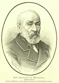 Masarnau was born in Madrid in 1805 to Santiago Masarnau y Torres, a native of Copons in Catalonia and Beatriz Fernández y Carredano, from the Omoño sector of the town of Ribamontán al Monte in Cantabria, a family with close connections to the Spanish aristocracy and court. His mother died in 1808. At that same time, after the abdication of King Ferdinand VII of Spain and the subsequent outbreak of the Peninsular War, Masarnau senior was appointed the Secretary of the Royal Association of Nobility of Córdoba, in the service of the Count of Miranda, and the father moved with his three children to Andalucia. The son proved to be a musical prodigy in his childhood, and soon began the study of music under the organist of the Cathedral of Granada, José Rouré y Llamas. When King Ferdinand regained the throne in 1814, the father was appointed a secretary to the Chief Royal Majordomo (Camarero mayor) and the family returned to Madrid.[1] There the son was able to participate in the musical life of the Escorial, performing on the organ before King Ferdinand (including some of his own compositions) when he was only ten years old. Life at court was highly dependent on royal favour, and Masarnau's father was obliged, for unclear reasons, to quit his privileges as a Gentleman of the Royal Household in the 1820s.