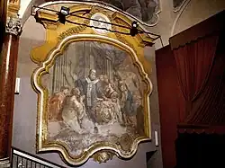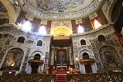 Inside there are three chapels. The largest one is dominated by a small dome frescoed by Filippo Tancredi. The frescoes on the walls of the entrance staircase depict the Miracle of the Healing of the Child by St Basil and St Basil preaching, painted by Vito D'Anna. In the apse is a large marble group representing the Crucified Christ between the Archangel Michael, Saint Cajetan, and Saint Mary Magdalene. Overlooking the present presbytery is a 1725 painting by Cedri depicting the Coronation of Santa Rosalia; it was formerly housed in the nearby Benedictine Monastery of Santa Rosalia, which was razed in the 20th century to expand the Via Roma.[1]
