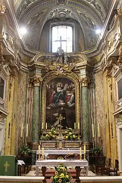 It is on the site of the medieval church San Salvatore in pensilis[1] de Sorraca,[2] built on the remains of the Circus Flaminius (and recorded in several documents between 1174 and 1209). An inscription now housed in the entrance of the Palazzo Busiri on via Aurora (all that remains of the medieval church) refers to this church's rebuilding being completed on 28 October 1285 "per venerabilem Hieronymum episcopum Prenestinum".