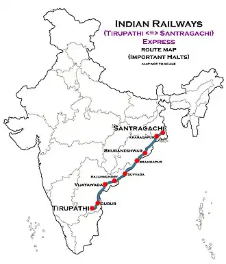 The 22855 / 56 Santragachi–Tirupati Express runs from Santragachi via Kharagpur Junction, Khurda Road Junction, Visakhapatnam, Vijayawada Junction, Gudur Junction, Renigunta Junction to Tirupati.[4]