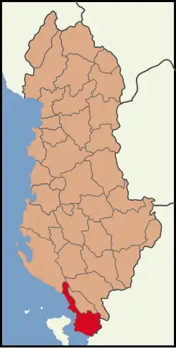 Sarandë District (Albanian: Rrethi i Sarandës) was one of the 36 districts of Albania, which were dissolved in July 2000 and replaced by 12 newly created counties. It had a population of 35,235 in 2001, and an area of 730 km2 (280 sq mi).[1] The centre of the district was the city of Sarandë. Other places included Konispol (at the border with Greece), Ksamil (a resort), Çukë, Vrinë and Butrint (an archeological site). Its territory is now part of Vlorë County: the municipalities of Sarandë, Konispol, Finiq (partly) and Himara (partly).