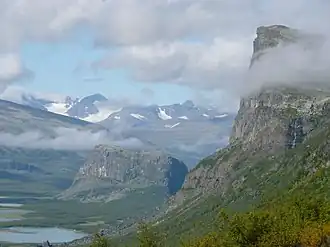 The park is made up of three types of landscape, sometimes difficult to differentiate between: large valleys, massive mountains, and high plateaux.[9] The largest valley of the park, which is also the most noted, is the Rapa Valley.[10] This valley occupies 40 km2 (15 sq mi)[11] of the park, including several branches, the most important of which are the Sarvesvagge, which climbs as far as Padjelanta,[12] the Kuopervagge — with an area of nearly 20 km2 (7.7 sq mi) — and the Ruotesvagge, surrounded by numerous glaciers, including those of Mount Sarektjåkkå.[13] Among the other notable valleys, outside the Rapadalen network, are the Kukkesvagge that makes up the north-eastern border of the park,[13] and the Njåtsosvagge near the southern border.[9] The largest plateau is the Ivarlako, east of the Pårte massif, with an altitude starting at 660–850 m (2,170–2,790 ft).[14] West of Pårte, the Luottolako plateau covers an area of 45 km2 (17 sq mi) and has an even higher altitude at 1,200–1,400 m (3,900–4,600 ft).[14]