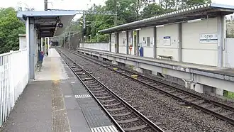 The station has two opposed side platforms on an embankment, with the station building located underneath. The station building has automated ticket machines, TOICA automated turnstiles and is unattended.