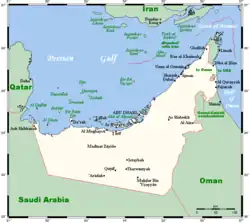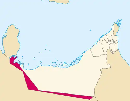Map of the United Arab Emirates showing the pre-1974 boundary; note that by this map the UAE borders Qatar