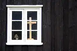 Saurbæjarkirkja church has thick turf and stone walls on the outside for protection against the weather, and turf on the roof. It was built in 1858 by Olaf Briem (1808-59), who studied carpentry in Copenhagen. It is one of only six turf churches still extant in Iceland. Most churches in the country were built of this material until well into the 19th century. Inside, the church has a wooden frame construction. Churches of this type had no tower, and the bells usually hung from the front gable. Saurbæjarkirkja church is now under care of the National Museum of Iceland (Þjóðminjasafn Íslands). [2]