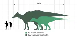 Saurolophus is known from material including nearly complete skeletons, giving researchers a clear picture of its bony anatomy. S. osborni, the rarer Albertan species, was around 8.2–8.5 m (27–28 ft) long, with its skull 1.0 m (3.3 ft) long.[16][17] It has been estimated to have weighed around 3 tonnes (3.0 long tons; 3.3 short tons).[17] The larger Mongolian species S. angustirostris was around 13 m (43 ft) long and weighed up to 11 tonnes (11 long tons; 12 short tons).[17] The largest known skull of S.angustirostris measures 1.22 m (4.0 ft) in length.[8] Aside from size, the two species are virtually identical, with differentiation hindered by lack of study.[10]