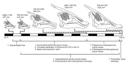 In 2015 Leonard Dewaele and colleagues described a small and partial nest containing several juveniles of S. angustirostris. The specimen (MPC-D 100/764) was recovered from the notorious Dragon's Tomb assambleage of the Nemegt Formation. The team noted that among remains, three or even four juveniles can be recognized, and two fragmentary eggshells were found in association. Juveniles within this block were identified as perinates, as they had skull lengths less than five percent of the length of the skulls of the adults, indicating they were in the earliest developmental stage at the time of their deaths. Based on these juveniles, Dewaele and team indicated that during the ontogeny of S. angustirostris the distinct crest found in adults was poorly developed in infancy, the snout grew proportionally longer, the orbit became more oval-shaped, the doming of the frontal became less prominent, and the coronoid process became higher.[25]