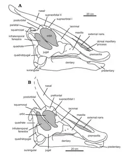 The most distinctive feature of Saurolophus is its cranial crest, which is present in young individuals, but is smaller. It is long and spike-like and projects upward and backward at about a 45° angle, starting from over the eyes. This crest is often described as solid, but appears to be solid only at the point, with internal chambers that may have had a respiratory and/or heat-regulation function.[18] The unique crest of Saurolophus is made up almost completely by the nasal bones, and in S. angustirostris it is solid. In adult specimens the crests are a rounded triangular shape in cross section. The crest protrudes past the edge of the skull backwards. Thin processes from the frontals and prefrontals extend along the underside of the crest, probably to strengthen it. At the end of the crest is a swelling of the nasal, which is often termed differently.[8]