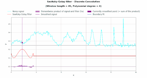 Application of the smoothing to a noisy signal with Gaussian peaks via a discrete convolution with a subsequent polynomial fit at the boundaries. Compared to the sequential direct polynomial fitting shown above, this can be achieved more efficiently. The sudden drops to 0 at the edges of the filter cause discontinuities which limit the noise suppression capabilities of the Savitzky-Golay filter in practice.