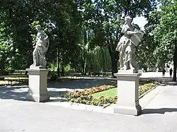 - Sandstone statues, a part of the rich collection of sculptures removed to Saint Petersburg after recapturing the city by Marshal Suvorov in 1794, and placed in the Summer Garden.[6] According to the 1745 plan of the Saxon Garden there were 70 postuments in the garden, and in 1797 there were only 37 sculptures left;[6] only 20 of them have been preserved until our times. Four of these sculptures were completely destroyed during the blowing up of the Saxon Palace in 1944, but they were later reconstructed.[6] Included are groups of sculptures, including Arithmetic, Astronomy, Bacchus, Flora, Geography, two sculptures identified as Glory, Instruct, Intelligence, Intellect, Justice, Medicine, Military Architecture, Painting, Poetry, Rationality, Science, Sculpture, Venus and Winter. They were generally made before 1745 by anonymous Warsaw sculptors under the direction of Johann Georg Plersch.[6]