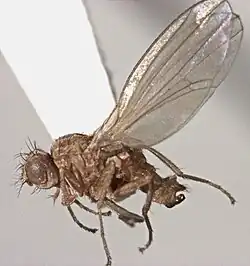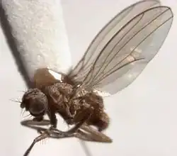 Scaptomyza flava is an herbivorous leaf mining fly species in the family Drosophilidae. In Latin, flava means golden or yellow.[1] The fly is amber to dark brown in color and approximately 2.5 mm in length.[2][3] In Europe and New Zealand[4][5][6] the larvae are pests of plants in the order Brassicales, including arugula, brassicas, broccoli, Brussels sprouts, bok choy, cabbage, canola, cauliflower, horseradish, kale, kohlrabi, napa cabbage, nasturtium, radish, rapini, rutabaga, turnip, wasabi and watercress.[4] In New Zealand, its range has expanded to include host species that are intercropped with salad brassicas, including gypsophila, otherwise known as baby's breath, which is in the pink family (Caryophyllaceae) and the pea (Pisum sativum) in the Fabaceae.[6] More typically, S. flava is oligophagous within the Brassicales. Scaptomyza are unusual within the Drospophilidae because the group includes species that are truly herbivorous.[7][8][6] Other herbivorous drosophilids include D. suzukii, which attacks fruit very early during ripening[9] (and so is a frugivore) and species within the genus Lordiphosa, from Africa and Asia, which also include leaf miners.[10] Most drosophilids feed on microbes associated with decaying vegetation and sap fluxes.[11]