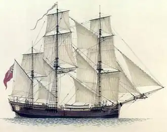 - ^ The 411 tons comes from the Register of Transports 1774-1794", Admiralty 49/127. Cited in Bateson.[5] Contemporary Admiralty surveys also record a figure of 41836⁄94 tons (bm), based on design. An informal source, First Fleet Lieutenant Phillip Gidley King, estimated Scarborough at 430 tons (bm).[5]