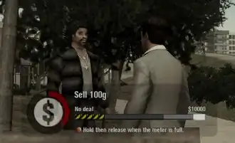 The "golf swing" minigame used for cocaine deals, bribing cops and intimidating gangs. Here Tony is selling cocaine to a street dealer. The player must try to land the meter in the white zone on the right to get maximum profit. If the meter lands in the "no deal" zone, Tony will be attacked.