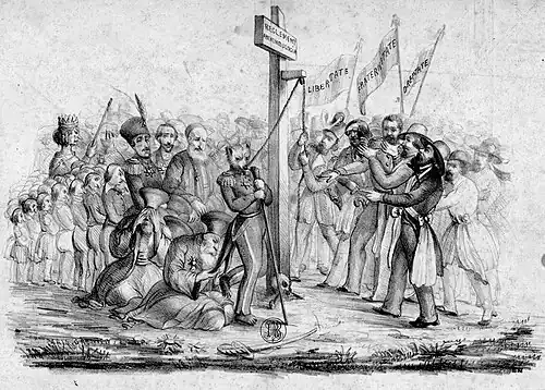 The revolutionaries' resolve was finally tested in September, when Wallachia was invaded—first by the Ottomans, and immediately after by the Russians. At Pitești and Râmnicu Vâlcea, Demostene gathered up survivors of the battle which had taken place on Dealul Spirii.[7] As reported by Pelimon, Scarlat tried to put up some resistance to the Russian armies storming in from Putna. He could only muster "some tricolor flags and groups of villagers", although he also heard pledges of support from Russian deserters—he informed his government of this, but was ordered not to put up resistance.[33] His area of operations fell under a Russian occupation, on September 15, with A. Borănescu assigned as the county leader; the deposed Turnavitu hoped to appease the Cossacks by crossing their path with a procession of peasants and priests.[34] As noted in an 1850 propaganda brochure by revolutionary exiles, he had tried to appeal to the common denominator of Romanians and Russian sharing an Orthodox faith: "But these Orthodox [emphasis in the original], under orders from General Luders, trampled upon the cross and the Gospels, chased down and dispersed The People with their sabres and bayonets, and put priests in chains."[35] A manhunt of the revolutionaries was carried out on the spot, with Turnavitu appearing as the county's third most wanted revolutionary figure—behind Șonțu and the woodworker Simion.[36] He remained in Focșanii Munteniei. Though his fellow revolutionaries claimed that he voluntarily surrendered to the Cossacks "in order to endure the same fate as his compatriots",[37] he in fact tried to hide at the French Republic's local consulate. He asked and obtained political asylum, but was found out in the consul's home and arrested, against the provisions of international law.[7][12]