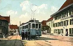 Meanwhile, the Wynental municipalities also came to the conclusion that a narrow-gauge electric tram would be more economic. A company by the name of the Wynental Railway (WTB) was created to operate the new line and in January 1903 construction works were started. The opening of the Wynentalbahn (WTB) between Aarau and Reinach was on March 5, 1904, the extension to Menziken followed a few weeks later on 1 May. Both lines had their starting point in the street on the north side of SBB's Aarau railway station. In 1924, the WTB opened its own station south of the SBB railway lines, whilst the AS continued running through the city streets to its stop on the north of the SBB station, thus meaning that the direct connection between WTB and AS was lost.[2]