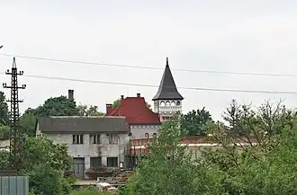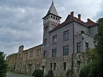 In 1817, the Mukachevo-Chynadiyovo estate became the property of the Austrian branch of the Schönborn family, the Counts of Schönborn-Buchheim. During the second half of the 19th century, Count Erwein-Friedrich von Schönborn-Buchheim (1842–1903) built a summer residence in Berehove in the neo-romantic style.[2] Situated at the foot of a mountain on the northeastern outskirts of the city, the residence featured a tall tower with a pointed roof, giving it the appearance of a medieval castle.[2] A park was also designed nearby.[2]