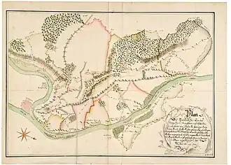In the First Coalition War in October 1794, the French revolutionary army approached Koblenz from the North after the battle of Fleurus.[1][2] Schloss Schönbornslust was in the middle of the fighting and was destroyed.[1][2] After looting, the palace ruins were sold together and in 1806 completely broken off and levelled.[1][2] Two economic buildings are located near the former monastery Maria Trost.[1][2] Today there is a dense industrial area on the location of the palace and nothing remains.[1][2]