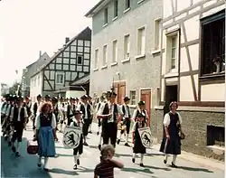 Schützenfests may range from one day to several days and may include and be accompanied by various events. They often occur in the festival room of a local public house or in a pavilion especially erected for the occasion. In the Sauerland, many towns have a special Marksmen's Hall that is used for these festivities. Many Schützenfests start with a festive procession, whereby the reigning King of Marksmen, the royal household, and local dignitaries are all escorted by the marksmen and paraded to the festive square or the festivities. This is often followed by a "royal parade" where the marksmen march past the king and the royal court, with marching bands, Corps of Drums, and fanfare bands playing along. The parading marksmen are formed in platoons or squads depending on the size of the formation, and in large towns and cities, marksmen are formed in companies and in both cases of the parade color guards march along with them. In a lot of cases, the pavilion is surrounded by a funfair.