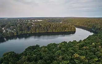 Schlachtensee (German pronunciation: [ˈʃlaxtn̩ˌzeː] ⓘ) is a lake in the south west of Berlin, in the Steglitz-Zehlendorf borough (in the quarters of Schlachtensee), on the edge of the Grunewald forest. The lake lends its name to the surrounding area and to the nearby Studentendorf Schlachtensee, a student residence. The area has been part of Berlin since 1920.