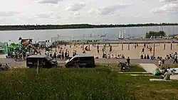 Since August 2003 there are four volleyball courts suitable for tournaments at Schladitzer Bucht (Schladitz Bay) on the Schladitz side of the lake (the southeast side).[5] Since then, beach volleyball, beach handball and beach soccer tournaments are held regularly during the season.[1] Among other things, the qualification for the German championships in beach volleyball, the „Sachsenmasters“, is held here. The Schladitz Bay was managed by a water sports school from June 2003 and from 2013 it was expanded into a sports resort with water sports offers and courses, accommodation and camping.[6]