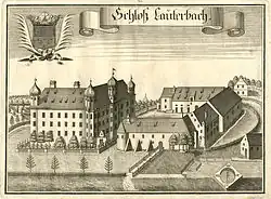 The Lauterbach estate was established by the first half of the 13th century. The Dachau family made Lauterbach their seat from around 1250 to 1437. The castle then passed through marriage to Veit von Eglofstein. He and his wife sold the castle in 1449, and there were various changes of ownership in the next hundred years. In 1550 Jörg or Georg Hundt zu Lauterbach und Valkenstein took possession and restored the castle. At this time it was a tall rectangular building surrounded by a thick ring wall, with defensive towers in the four corners. The castle was damaged during the Thirty Years' War (1618–1648).[2] By the end of the war it had been burned down.[3] In the second half of the 17th century Johann Franz Maximilian Servatius von Hundt undertook a major restoration, depicted in engravings by Michael Wening.[2]