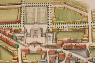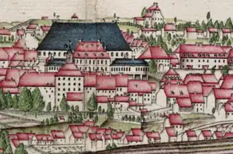 Schloss Pirmasens on a city view of Pirmasens around 1790 by Johann Michael Petzinger. In front of the palace is the city town hall, and in the back is the large drill house (collections Universitätsbibliothek Darmstadt)