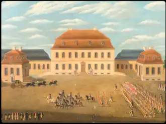 The palace’s rectangular main building, a plastered structure with nine window bays and a mansard roof, had four stories on its western side and two on the eastern side due to its sloping location.[2] Two ramps led to a grassy parterre on the west side, enclosed by a small guardhouse.[2] Two mansard-roofed outbuildings created an honorary courtyard on the eastern side.[2] To the south, parallel to one of the ramps, stood a long structure that housed stables and a barn.[2] In 1763, the side buildings were replaced by square pavilions, and the guardhouse was expanded into the main guard post.[2]