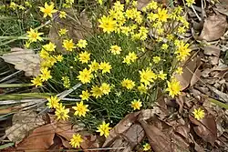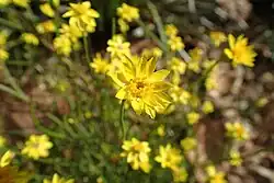 - Schoenia filifolia subsp. arenicola Paul G.Wilson[7] is an erect, annual herb, the heads of flowers arranged in an open corymb, the involucre cylindrical with the innermost bracts yellow, the ray florets 3–6 mm (0.12–0.24 in) long, flowering in August and September and the fruit a terete achene.[3][8]