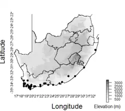 Schoenus auritus generally grows without 200 km of the coastline in South Africa, with its distribution ranging from northern parts of the KwaZulu-Natal Province to the Western Cape Province.[1]