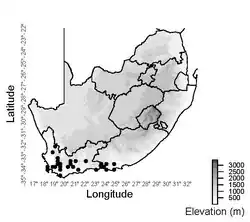 The known distribution of S. selinae ranges from the Cederberg Mountains in the Western Cape Province to the Humansdorp region in the Eastern Cape Province of South Africa.[1] The known elevation range of this species is between 150 and 1700 metres, and it occurs generally on wet mountainous sites with a couple of collections made from forest margins.[1]