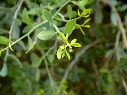 This species grows as a large shrub to small tree 8 to 10 ft (2.4 to 3.0 m) high. The branches are rigid and diverge widely, with the young branches minutely pubescent, while the older branches have smooth, grayish bark with white fissures. The leaves are arranged alternately, and are usually vertical due to a twist at their base. On the abaxial surface of the leaf are 3 faint ribs. The leaves are shaped obovate with smooth margins (not serrated), and covered with a glaucous layer, giving them a turquoise coloration.[1][3]