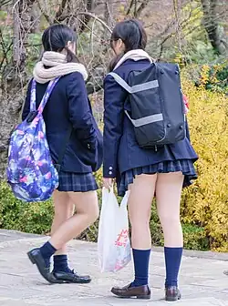 Bhutanese schoolchildren wear uniforms based on the country's national dress: gho for male students and kira for female students.[37]