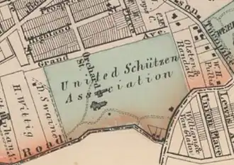 In 1864, nearby Union Hill was set apart from North Bergen as a separate municipality that had been originally settled by a group of German-Americans as early as 1851.[7] In 1872, the United Schützen Association opened a park on the site of the "Old Mansion" of the Wright family (see 1873 map illustration), featuring a new dancing pavilion, music stand and shooting gallery in addition to the landscape elements and green houses "just as Mr. Wright left them."[8] The Plattduetsche Volksfest Vereen organization of New York and New Jersey (PVV), which was created in 1874, purchased the property in 1894. It expanded into an amusement park that featured three dancing pavilions and ten bowling alleys, which entertained up to 50,000 attendees at a time with vaudeville performances and tournaments, parades, and fireworks.[9] Schuetzen is a derivative of the German word Schütze, meaning "shooter" or "rifleman". Originally encompassing about 32 acres,[6][9] the park's location on the western cuesta of the Hudson Palisades was chosen so that bullets could be directed into the side of the hill. Target practice continued at the park until 1935.[1] Over the years much of the property was sold off, a large portion of which was acquired by the government to build Route 495 leading to the Lincoln Tunnel.[9]