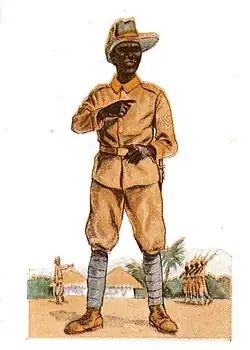 Schutztruppe Askaris wore a pocketless cotton khaki tunic and breeches with blue puttees and ankle boots, which replaced bare lower legs and feet. African personnel also wore a red fez over which a khaki cover could be worn in the field. Company numbers were often worn on the front of the fez. In field conditions the askari wore either a khaki cover over their red fez or a khaki tarbush consisting of a khaki cloth over a wicker frame. Later in the war African troops wore a large floppy hat en lieu of the fez.[13] The arm of service color for African/native troops was red so their uniforms, when trimmed, were trimmed red down the trousers seam, the tunic fly, collar edge, plus NCO's wore red, later brown, chevrons on the left sleeve only.[14]