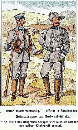 When the Schutztruppe for German East Africa was founded in 1891, special uniforms were created which, among other things, were intended to underline the special position of the Schutztruppe as an independent part of the Reichsheer. The uniforms corresponded to the cut of the Prussian Army, initially in grey but later in "field gray" for home service ("Tuchuniform"/"Tuchrock") or khaki ("Feldrock") for the tropics. Schutztruppen in Southwest Africa could wear the home service uniform in the protectorate. A khaki service dress was worn by all ranks while a white dress uniform was worn by European officers and NCOs for ceremonial occasions, both white and khaki uniforms were cut the same with four patch pockets and a stand and fall collar. The Schutztruppe arm of service color was blue so their uniforms were trimmed blue down the trousers seam, the fly of their tunic, collar edge, plus NCO's wore silver on blue inverted chevrons on the left sleeve only[12] They were also supplied a grey or khaki slouch hat called the Schutztruppenhut (aka Südwester) on which the edge of the hat and the cap band were in the color of the respective Schutztruppe. The protectorate colours were as follows; German East Africa white, Cameroon dark red, German South West Africa cornflower blue, Togo yellow, German New Guinea green, German Samoa light pink. Additionally, as Imperial Troops, the 'Reichskokarde' cockade in black, white and red was worn on the folded brim of the Schutztruppenhut, a black, white and red cord could be worn around the tropical helmet (Tropenhelm), and black, white and red intertwined shoulder straps were worn on both tunic shoulders.